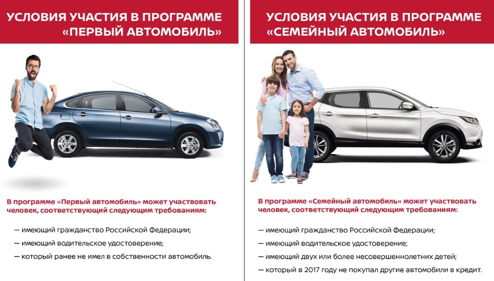 Предоставляют ее по программе «Первый автомобиль» (гражданам, которые приобретают автотранспортное средство в собственность впервые), а также «Семейный автомобиль» (семьям с двумя и более несовершеннолетними детьми).
