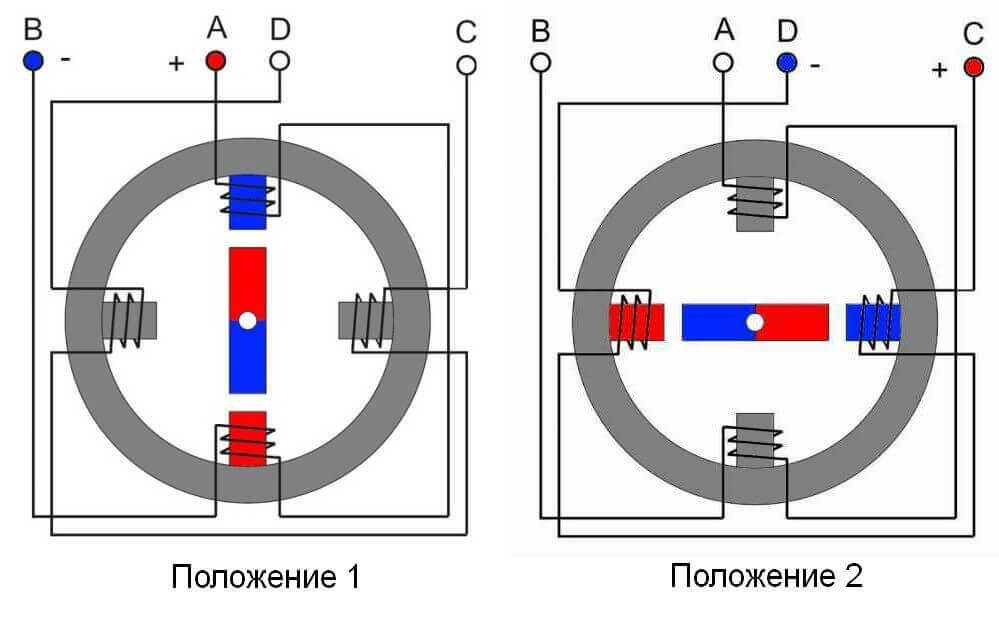 В момент подачи напряжения U1 в первую обмотку происходит перемещение ротора на те же 90º. В случае поочередной подачи напряжения U2, U3, U4 в соответствующие обмотки, вал продолжит вращение до завершения полного круга. После чего цикл повторяется снова. Для изменения направления вращения достаточно изменить очередность подачи импульсов в соответствующие обмотки.