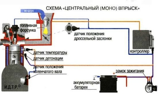 - Инжекторная система с центральной подачей топлива. Одна форсунка поставляет смесь топлива и воздуха в коллектор¸ после чего происходит её распределение по всем цилиндрам;