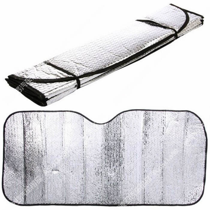 Для лобового стекла солнцезащитные экраны несколько иной структуры. С такой защитой не поедешь, так как она не прозрачна. Выполнены такие экраны из поверхностей на основе алюминия, которые имеют высокий процент светоотражения. Внутри, между этими поверхностями находится теплоизолятор на пенистой основе. Крепится такой экран на внутреннюю сторону лобового стекла с помощью четырёх присосок.