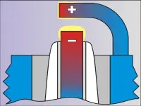 7 . Также интересен в прикладном смысле следующий факт. Положительно заряженные ионы представляют собой ядра молекул и обладают значительной массой. Из курса физики известно, что практически вся масса молекулы заключена в ядре, а масса электрона по сравнению с ядром ничтожна. Ионы, достигая отрицательного электрода, получают электрон и превращаются в нейтральную молекулу, но при этом они бомбардируют электрод, разрушая его кристаллическую решётку. На практике это выражается в эрозии электрода. Положительный электрод подвержен меньшему разрушению, ведь его бомбардируют электроны, обладающие малой массой.