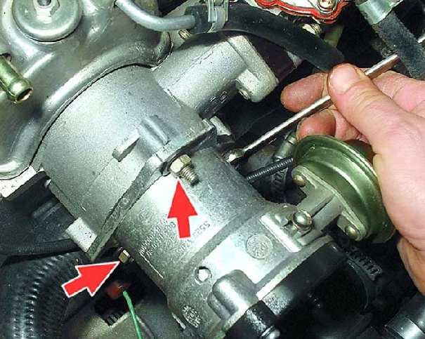 - Гайка-фиксатор, которая крепит трамблёр к блоку, ослабляется;