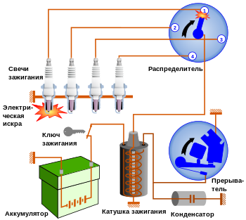 Система имеет 6- или 12-вольтовую батарею, заряжаемую генератором с приводом от двигателя для подачи электроэнергии; катушку для увеличения напряжения; устройство для прерывания тока от катушки; распределитель для подачи тока в правильный цилиндр; свечу, в каждом цилиндре. Ток идет от батареи через первичную обмотку катушки, через прерыватель и обратно к батарее.