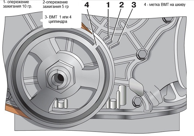 - Маховик крутится дальше, пока не совпадут метки его вала со средней меткой, находящейся на крышке газораспределительного механизма. В этом случае настройка зажигания позволит выставить угол на 5 градусов, а это нормально для автомобиля, использующегося на топливе 92 или 95.