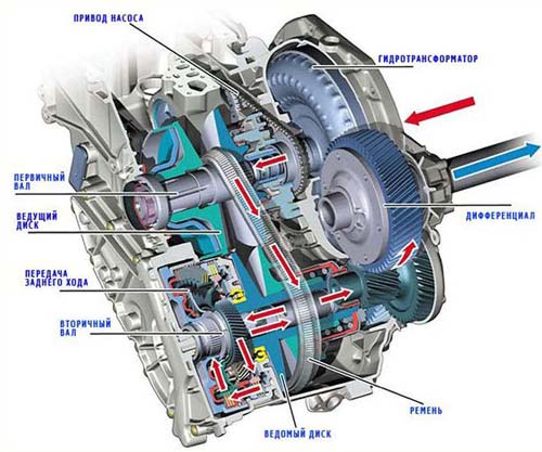Как и робот, вариатор устанавливается либо продольно, либо поперечно. Основные его компоненты: